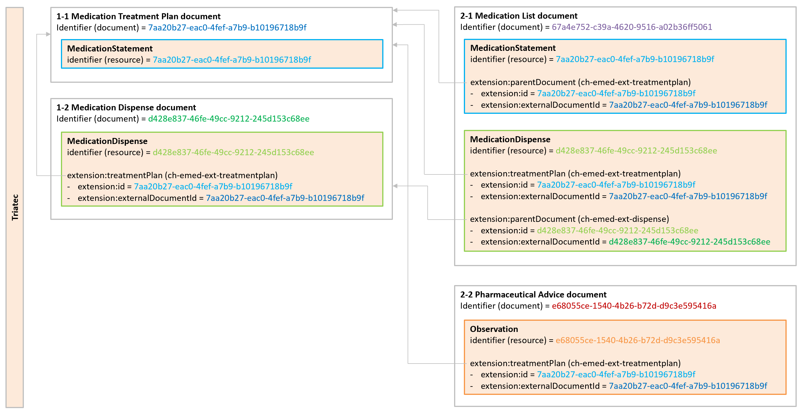 In order to represent the relationship between the individual eMedication documents and their resources (MedicationStatement, MedicationDispense, MedicationAdministration, MedicationRequest, Observation), extensions referencing the document and its resources are defined. These referencing mechanism is based on the usage of the identifiers from the document its resources.