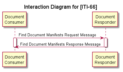 The Find Document Manifests [ITI-66] transaction is used to find DocumentManifest Resources that satisfy a set of parameters. It is equivalent to the FindSubmissionSets query in the Registry Stored Query [ITI-18] transaction, as documented in ITI TF-2a: 3.18.4.1.2.3.7.1. The result of the query is a Bundle containing DocumentManifest Resources that match the query parameters.