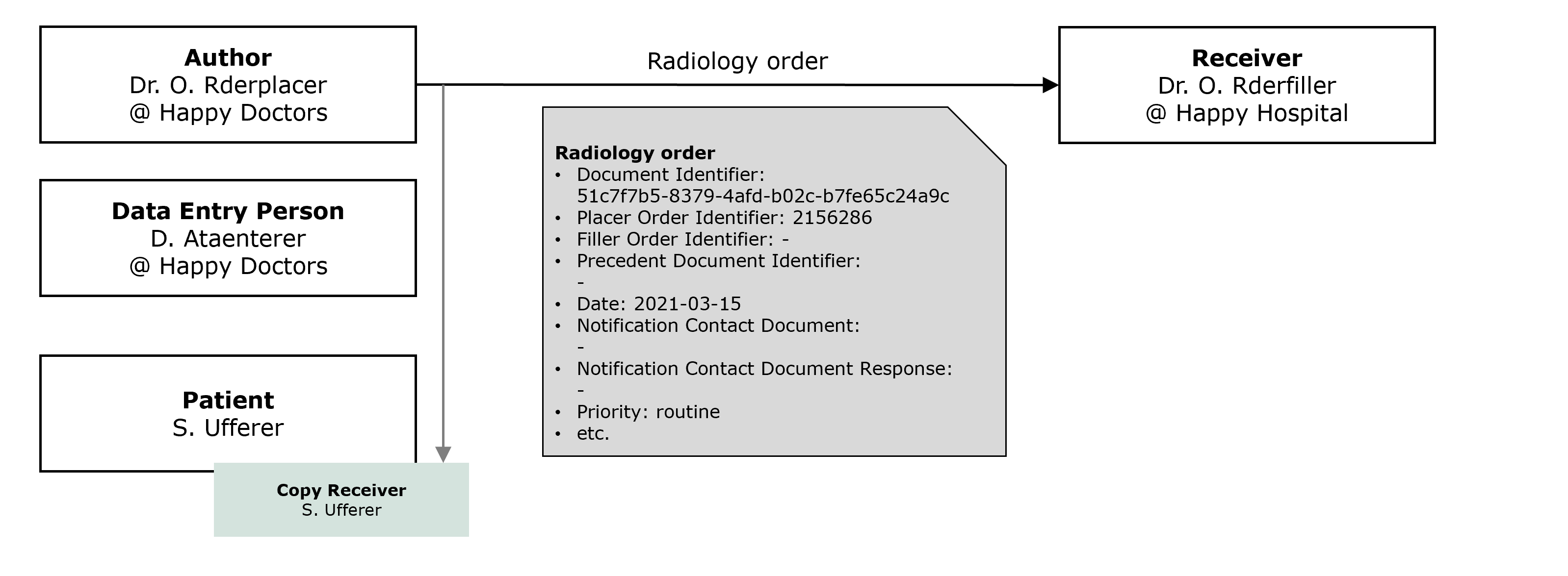 Madame S. Ufferer a rendez-vous le 15 mars 2021 chez son médecin généraliste, le Dr O. Rderplacer, au cabinet de groupe 'Happy Doctors'. La patiente se plaint de douleurs récurrentes au genou. Sur la base de l'anamnèse et de l'examen physique, le médecin décide de prescrire une radiographie qui sera réalisée à l'institut de radiologie de l'hôpital 'Happy Hospital' du Dr O. Rderfiller. L'assistante médicale D. Ataenterer saisit l'ordre de radiologie et l'envoie à l'institut de radiologie. Il est également indiqué dans le mandat que la copie de ce mandat (ainsi que tous les résultats qui en découlent) doit être envoyée à la patiente.